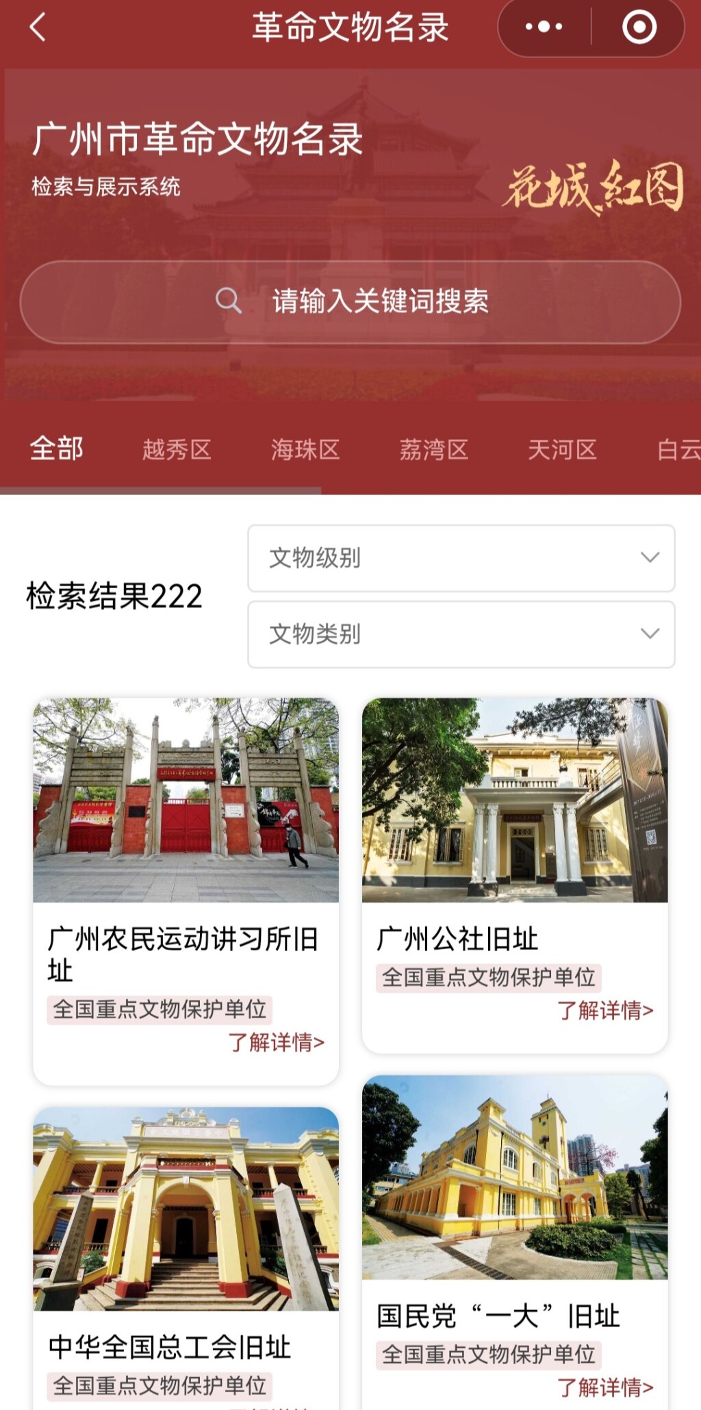 “花城紅圖”小法式周全收錄了廣州市已審定公布的各級不成變動位置反動文物信息,并樹立起最完全的廣州反動文物白色輿圖“怎麼了,花兒?先別激動,有什麼話,慢慢告包養網車馬費訴你媽,媽來了,來了。”藍媽媽被女兒激動的反應嚇了一跳,不理會她抓傷。