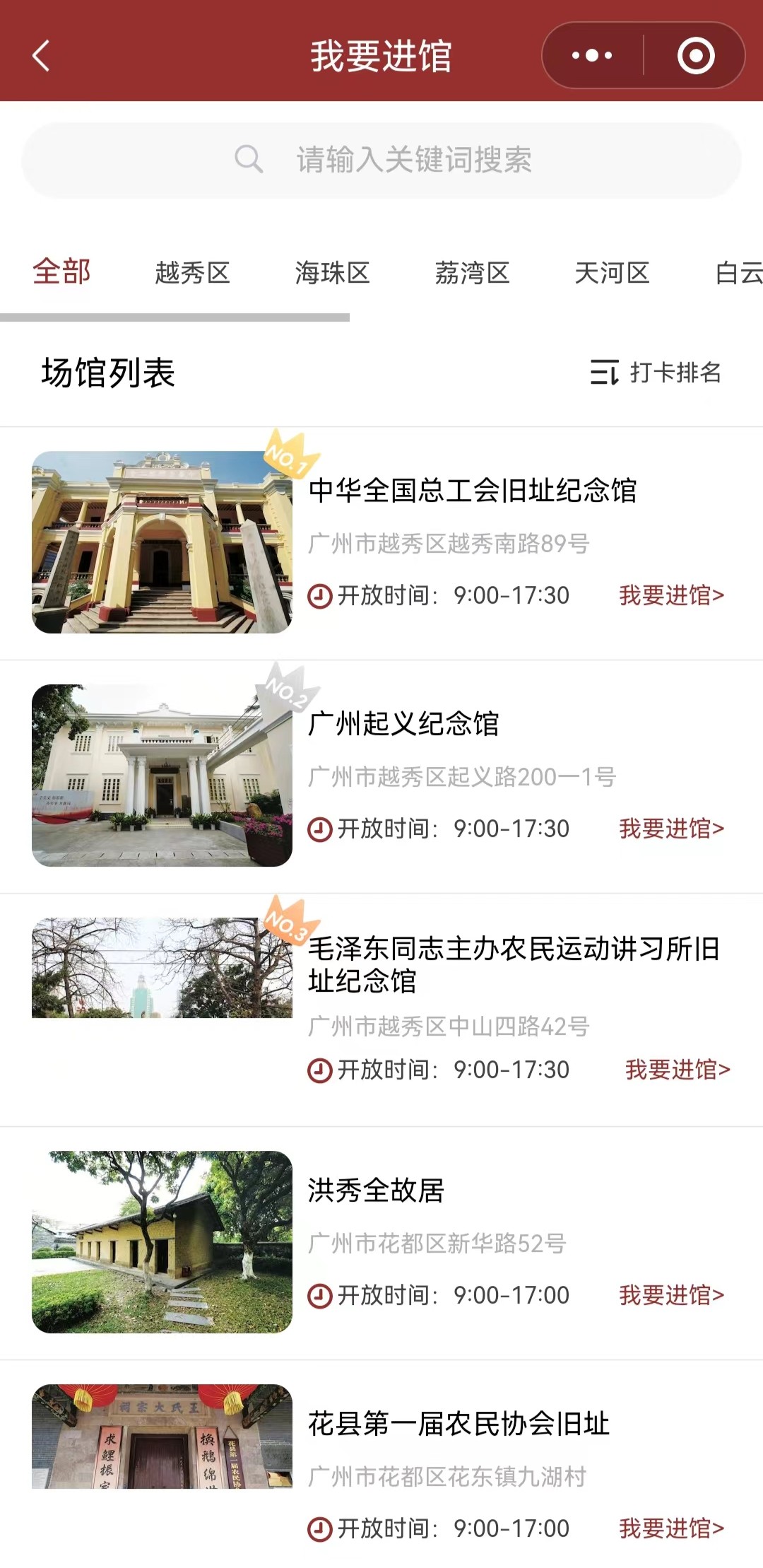 在“我要進館”效能中,更是整合了現有反動文物留念場館的觀賞預定小法式,點擊“我要進館”按鈕即可跳轉各場館小法式停止觀賞預定,無需再逐一查找,讓預定進館更便捷。